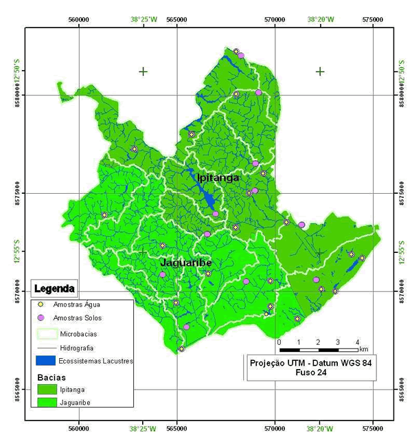 Bacias dos rios Jaguaribe e Ipitanga, pontos de amostragens de solo e água, hidrografia, ecossistemas lacustres e microbacias